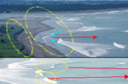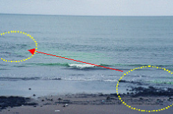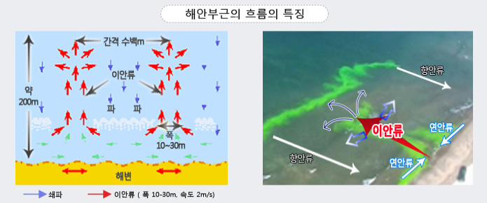 해변에 쓰레기가 수북이 모여 있는 부근에서는 바다 쪽으로 물이 흐르는 곳 일 가능성이 매우 높으므로 주의하여 볼 필요가 있음. 또한 바다 물이 주위에 비해 검게 보이는 곳도 주의하여야 함.