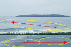 사진에서와 같이 국지적으로 해수면 표면에 작은 요철이 많이 생겨있는 곳은 이안류일 가능이 높다. 그러나 이러한 표면이 이동하고 있는 경우에는 물고기가 모여 있는 경우가 많으므로 자세히 관찰해 보아야 한다.
