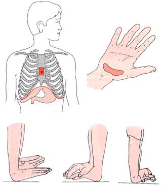 ②한 손바닥으로 환자의 명치와 배꼽사이에 올려 놓는다.
