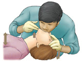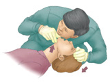 ① 기도를 개방한 채로 환자의 입에 구조자의 입을 전체로 감싸고, 이마 쪽 손은 환자의 코를 동시에 쥐어 막고, 다른 한 손은 턱을 들어 1회당 1초간 숨을 천천히 2회 불어 넣는다.