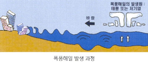 • 천문조에 의한 만조와 중첩될 경우 수위는 더욱 상승하는데, 특히 우리나라 서해안과 남해안은 조석 간만의 차가 커서 해일이 생기기 쉽다.