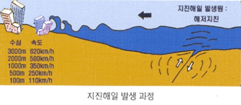 • 규모 6 이상의 해저 지진이나 진원의 깊이가 60km 이내, 그리고 수직적인 단층 운동인 경우에 많이 발생한다. 지진해일의 전파속도는 바다의 깊이가 깊을수록 빠르고, 얕을수록 느리다.