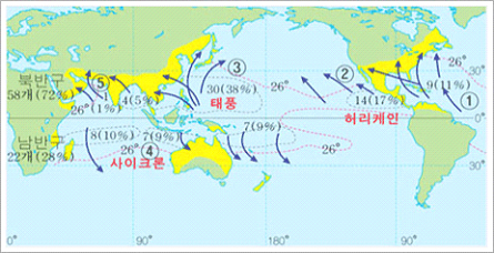 - 일반적으로 우리나라에 영향을 미치는 태풍은 7∼10월 사이에 많이 발생하며, 적도를 사이에 둔 남북 5 °이내에서는 거의 발생하지 않는다.